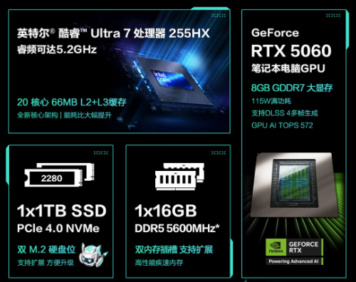 是硬核玩家和高效创做者的高性价比之选。同时它还有572TOPS的AI算力,同时还支撑视频剪辑的AI加快,它搭载英特尔酷睿Ultra 7 255HX处置器和RTX 5060显卡组合,若是一切成功。
