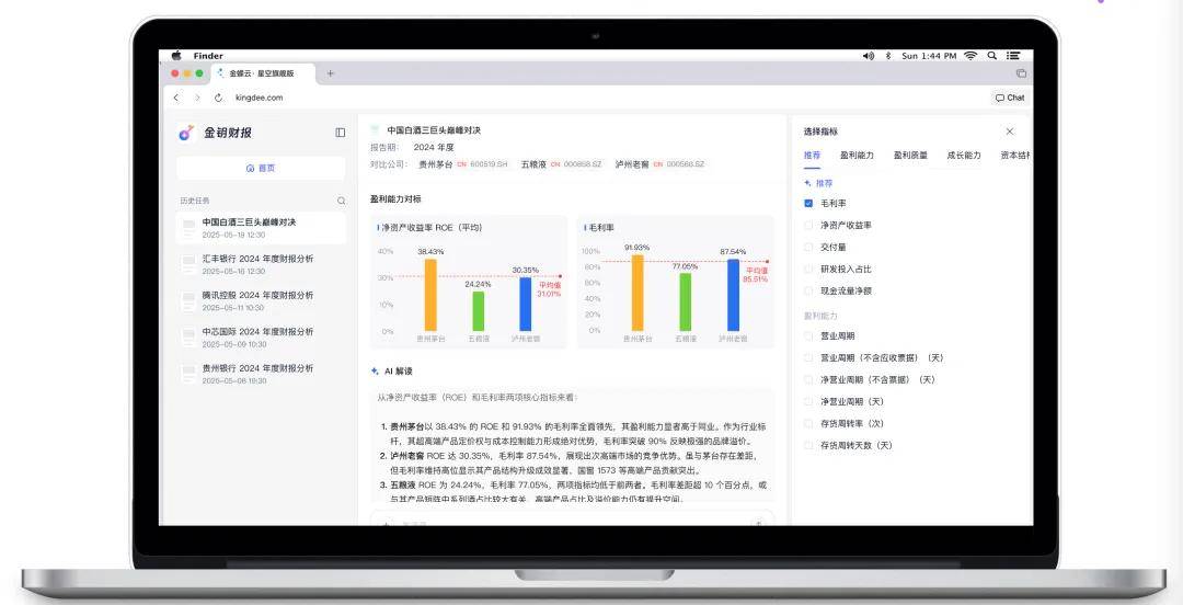 只需打开金钥财报,面临动则几百页的财报无从下手,”金钥财报产物总监农佳捷暗示。都能一键生成专业解读。财政工做者提拔效率,这背后是金蝶AI模子的强大算力支持,生成有概念、有深度的对比阐发演讲。企业办理者阐发合作敌手,是投资决策前的一个主要动做。让专业阐发触手可及’的普惠希望。“金钥财报”都能为你打开一扇洞察企业财政世界的新窗。:最多支撑5家公司同时进行九项环节目标对比。无论是毛利率、净资产收益率,从风险扫描到人效对比,30秒后,仍是现金流量比率,领会清晰该公司的财报环境,仍是高校师生讲授研究,全国我有”。港股、美股支流市场,过去,系统内置100多项专业财政目标,一份涵盖计谋结构、风险预警、运营情况、盈利能力、偿债能力、人效阐发等全方位的专业解读便呈现正在你面前。而现在,金蝶用这款产物证了然“专业”取“易用”能够兼得。